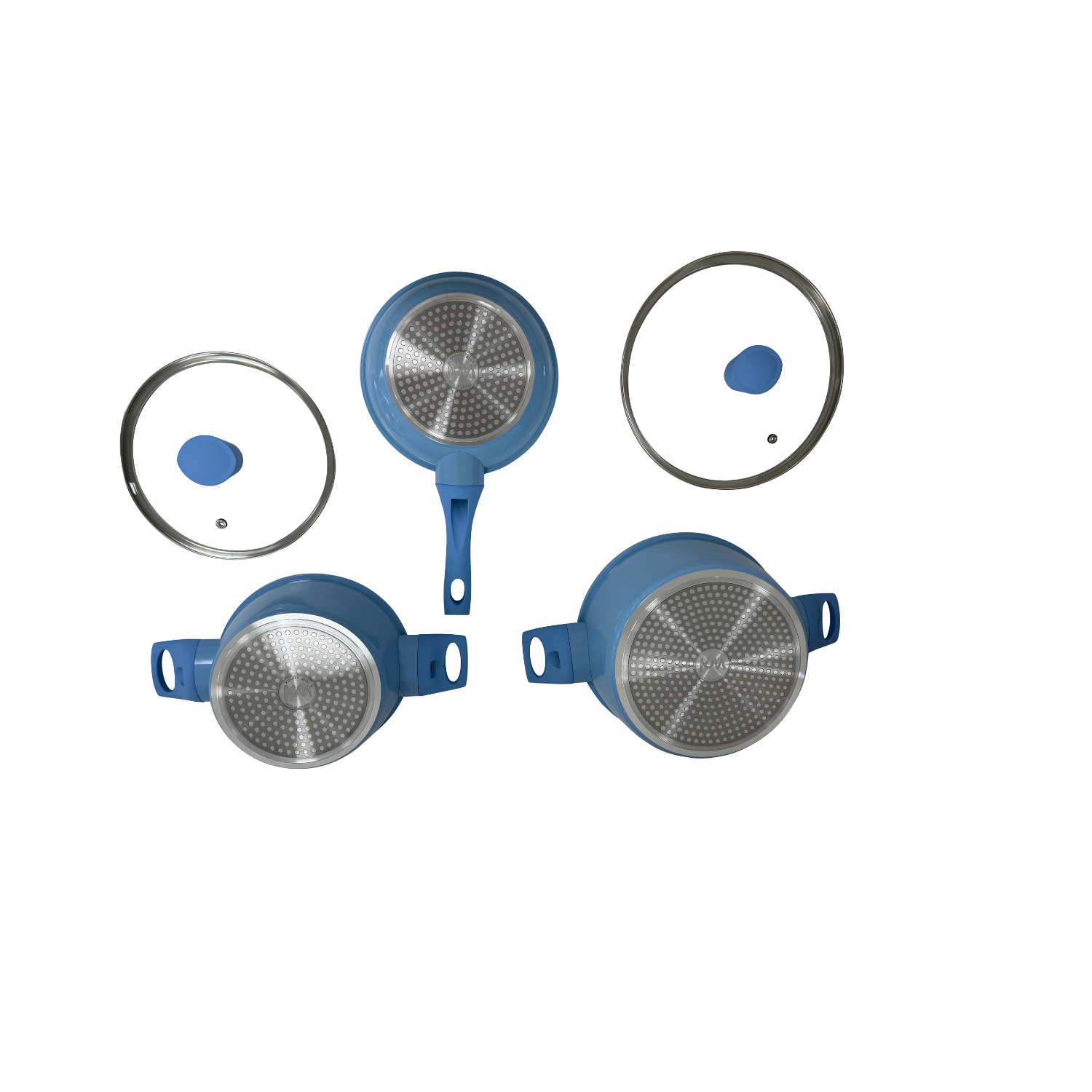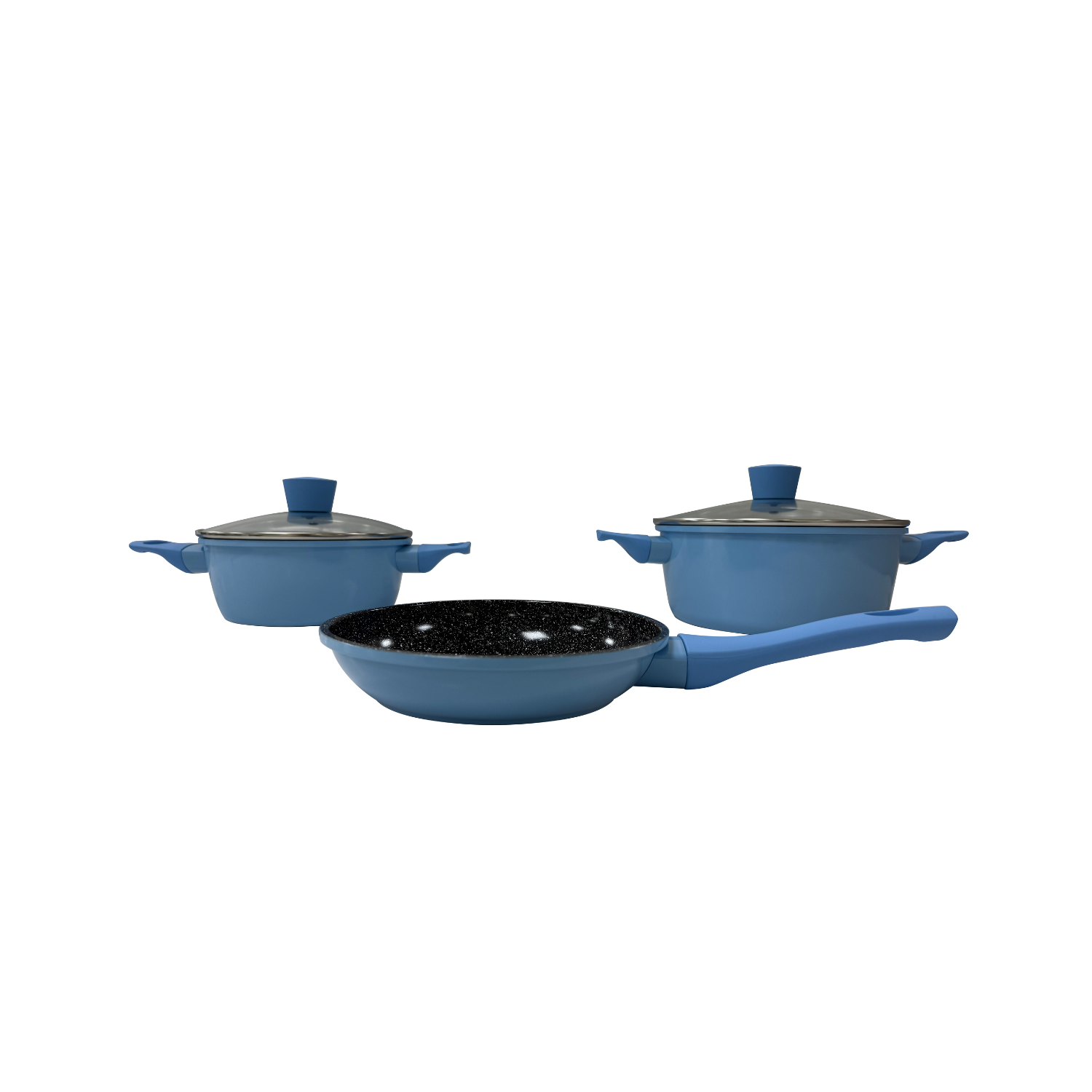 Set de ollas y sartén de aluminio forjado con recubrimiento antiadherente tipo granito. Incluye dos ollas con tapa de vidrio templado y un sartén. Color azul mate con interior negro moteado, diseño moderno y duradero ideal para todo tipo de cocina.